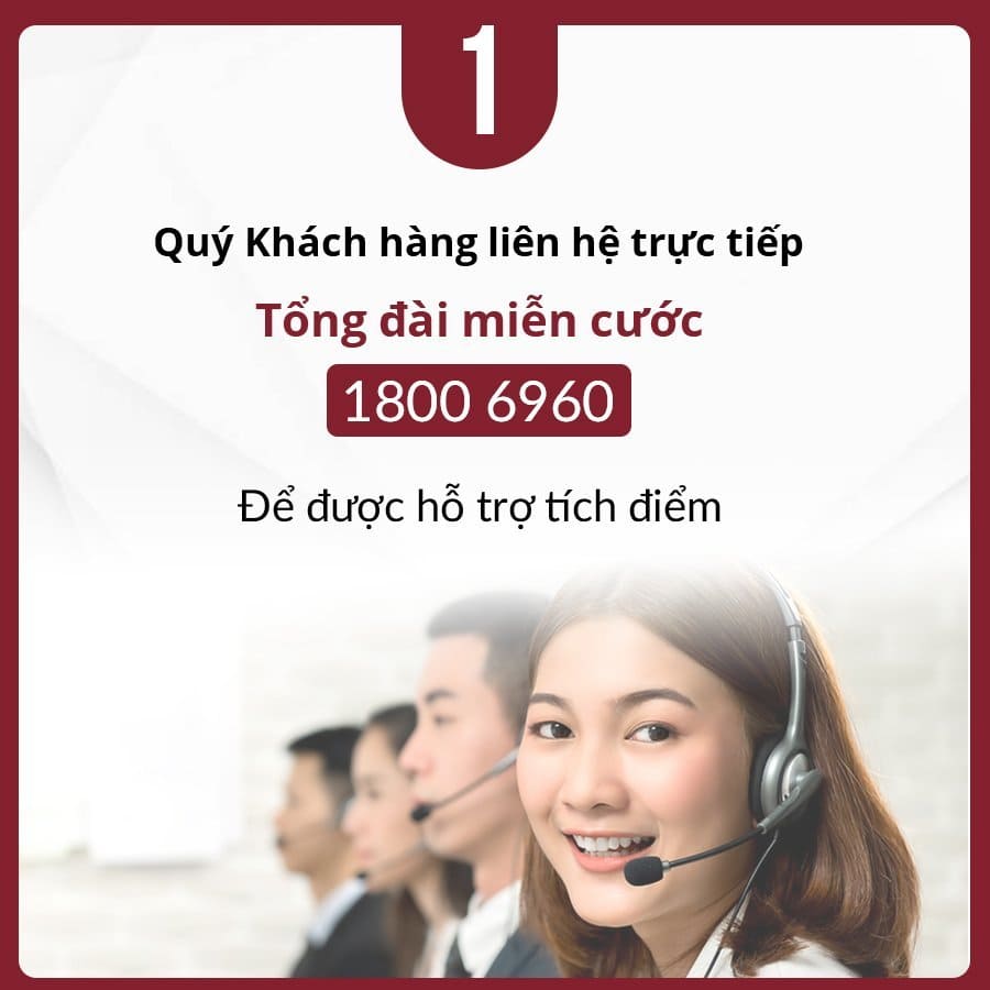 1. Qúy Khách hàng liên hệ trực tiếp tới Tổng đài miễn cước 1800 6960 để được hỗ trợ tích điểm.